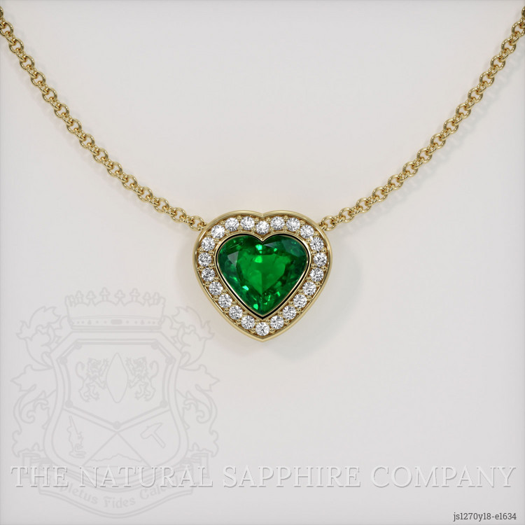 The pendant features a beautiful, transparent 1.83 carat heart shape green emerald with the dimensions of 8.13 x 9.04 x 4.91 mm and a mixed brilliant cut. It has a clarity grade of very slightly included (evaluated at eye level), vivid color saturation, and an excellent polish. The origin of this emerald is Zambia.