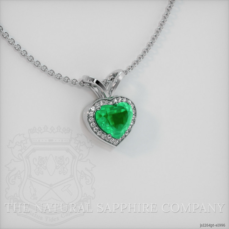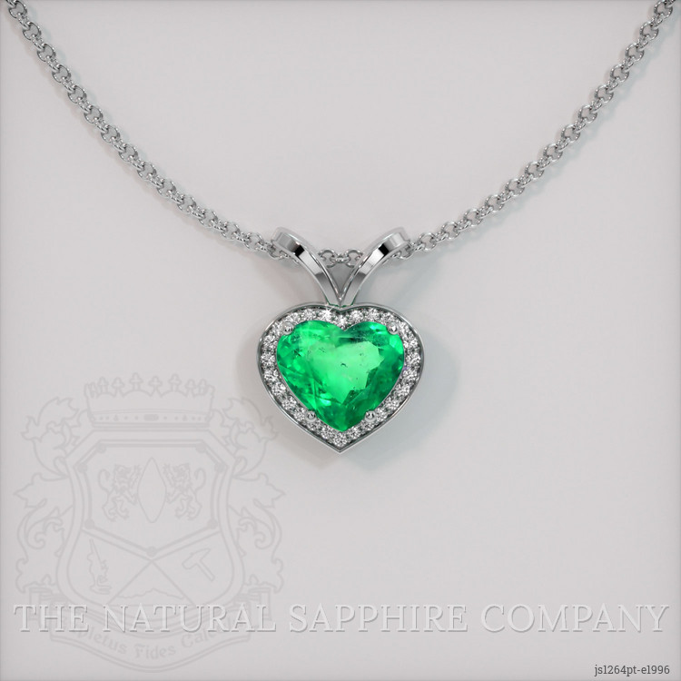 The pendant features a beautiful, transparent 6.31 carat heart shape green emerald with the dimensions of 11.72 x 13.62 x 7.32 mm and a mixed brilliant cut. It has a clarity grade of slightly included (evaluated at eye level), medium color saturation, and an excellent polish. The origin of this emerald is Colombia.