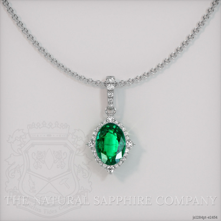 The pendant features a beautiful, transparent 1.21 carat oval shape green emerald with the dimensions of 8.31 x 5.84 x 4.05 mm and a mixed brilliant cut. It has a clarity grade of slightly included (evaluated at eye level), vivid color saturation, and an excellent polish. The origin of this emerald is Zambia.