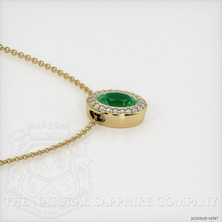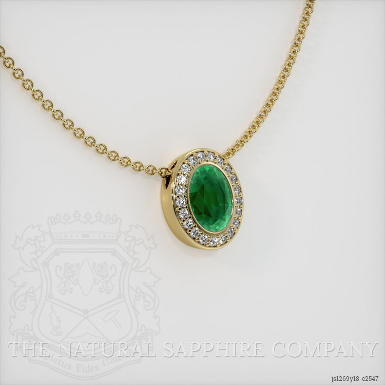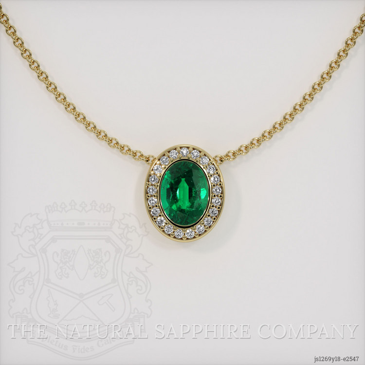 The pendant features a beautiful, transparent 1.62 carat oval shape green emerald with the dimensions of 8.88 x 6.71 x 4.75 mm and a mixed brilliant cut. It has a clarity grade of very slightly included (evaluated at eye level), vivid color saturation, and an excellent polish. The origin of this emerald is Zambia.