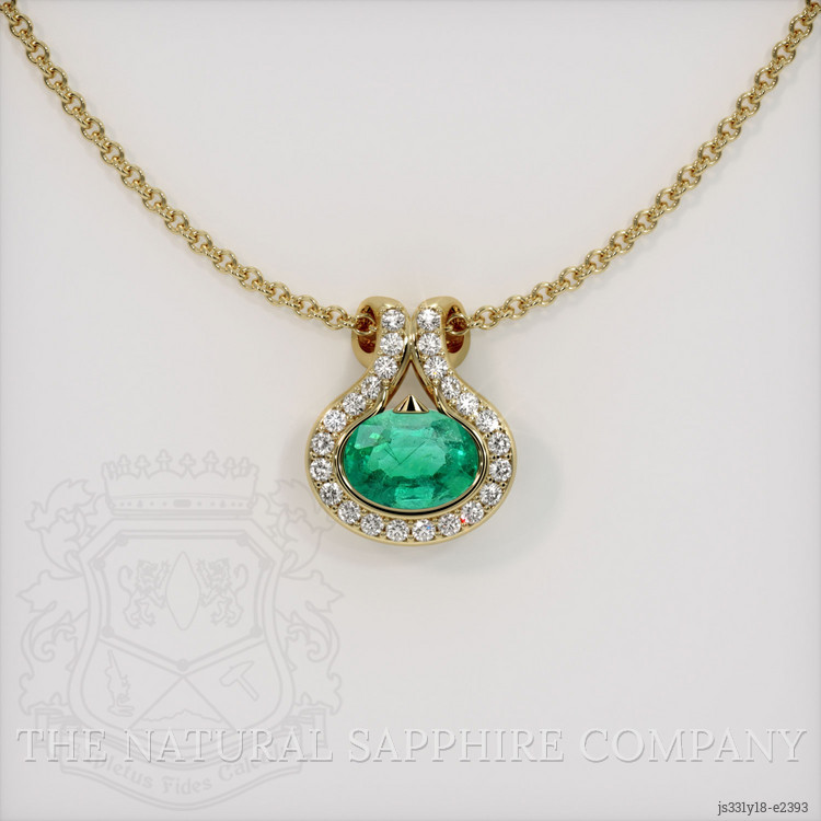 The pendant features a beautiful, transparent 1.71 carat oval shape green emerald with the dimensions of 9.14 x 7.05 x 4.42 mm and a mixed brilliant cut. It has a clarity grade of slightly included (evaluated at eye level), medium color saturation, and an excellent polish. The origin of this emerald is Zambia.