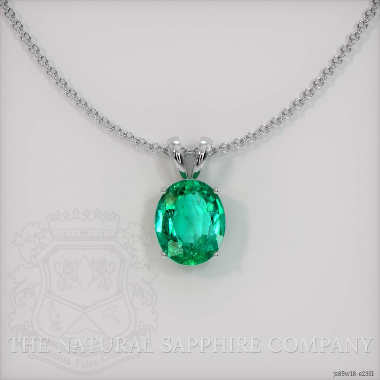The pendant features a beautiful, transparent 2.10 carat oval shape green emerald with the dimensions of 9.98 x 8.19 x 4.42 mm and a mixed brilliant cut. It has a clarity grade of slightly included (evaluated at eye level), medium color saturation, and an excellent polish. The origin of this emerald is Zambia.