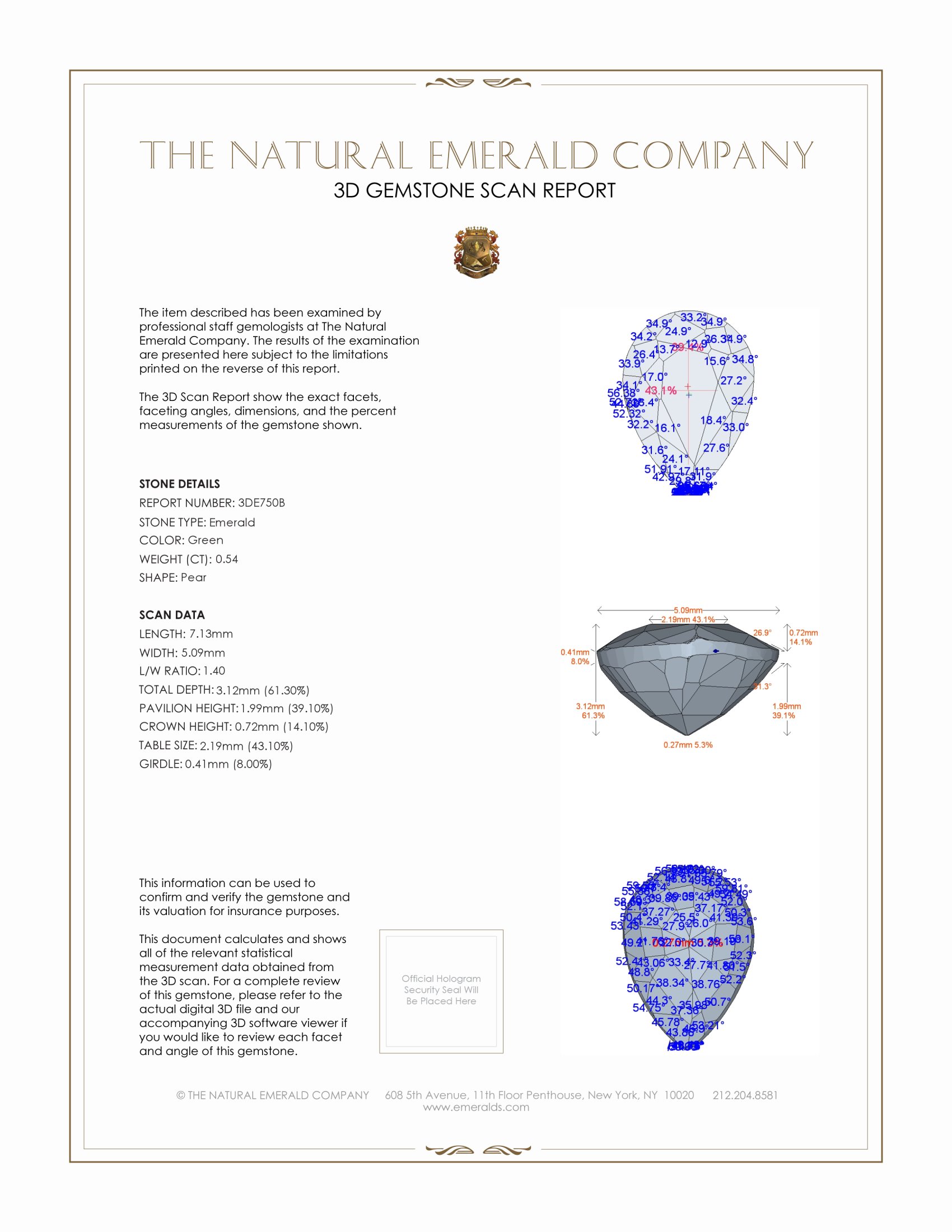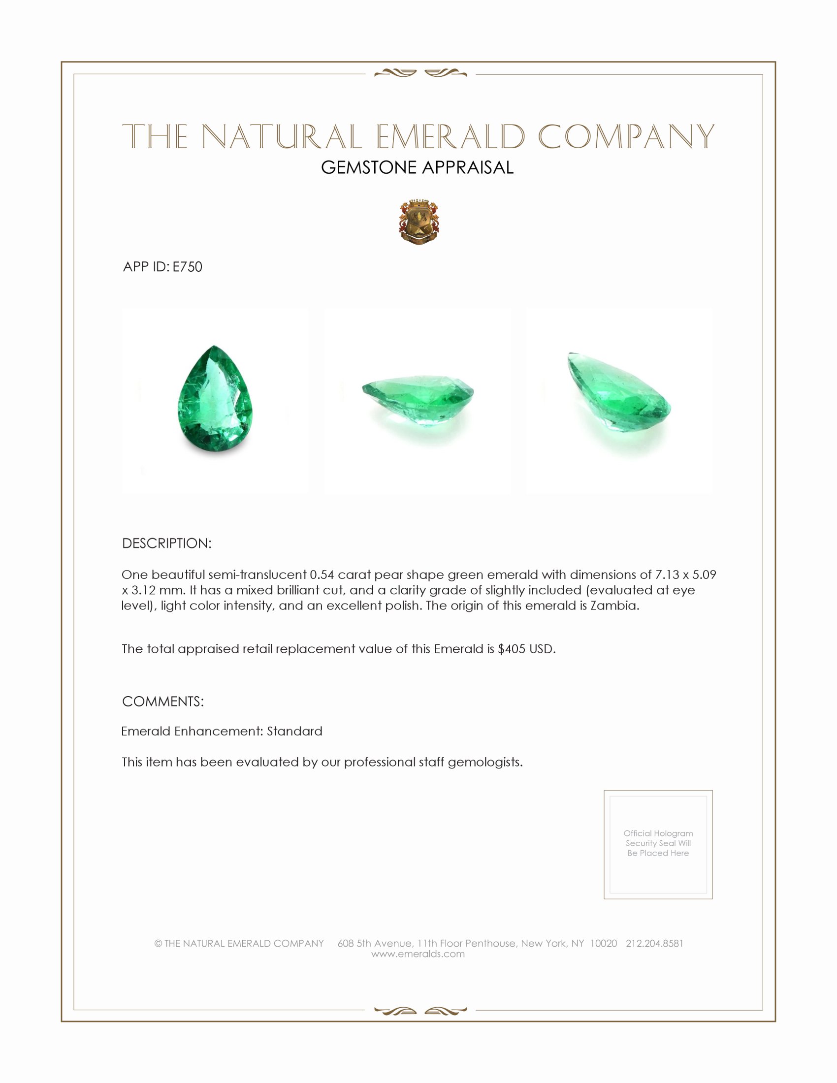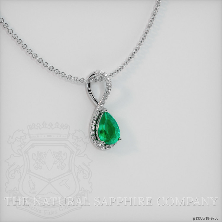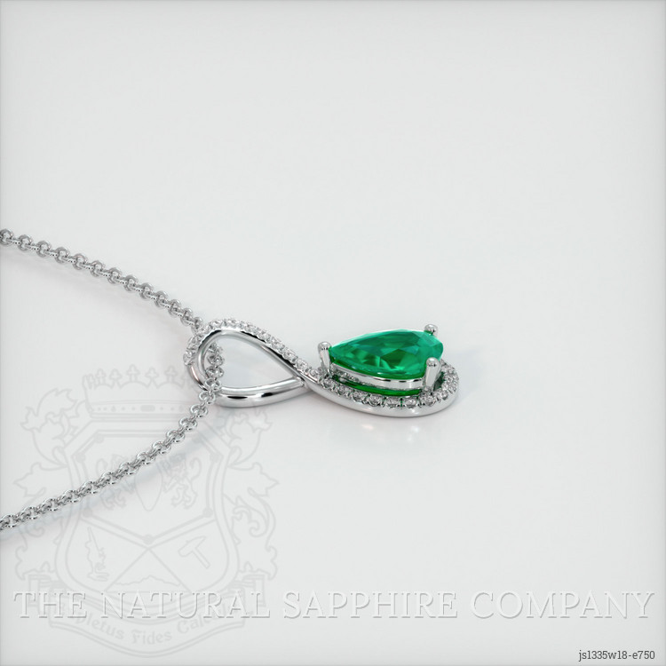 The pendant features a beautiful, semi-translucent 0.54 carat pear shape green emerald with the dimensions of 7.13 x 5.09 x 3.12 mm and a mixed brilliant cut. It has a clarity grade of slightly included (evaluated at eye level), light color saturation, and an excellent polish. The origin of this emerald is Zambia.