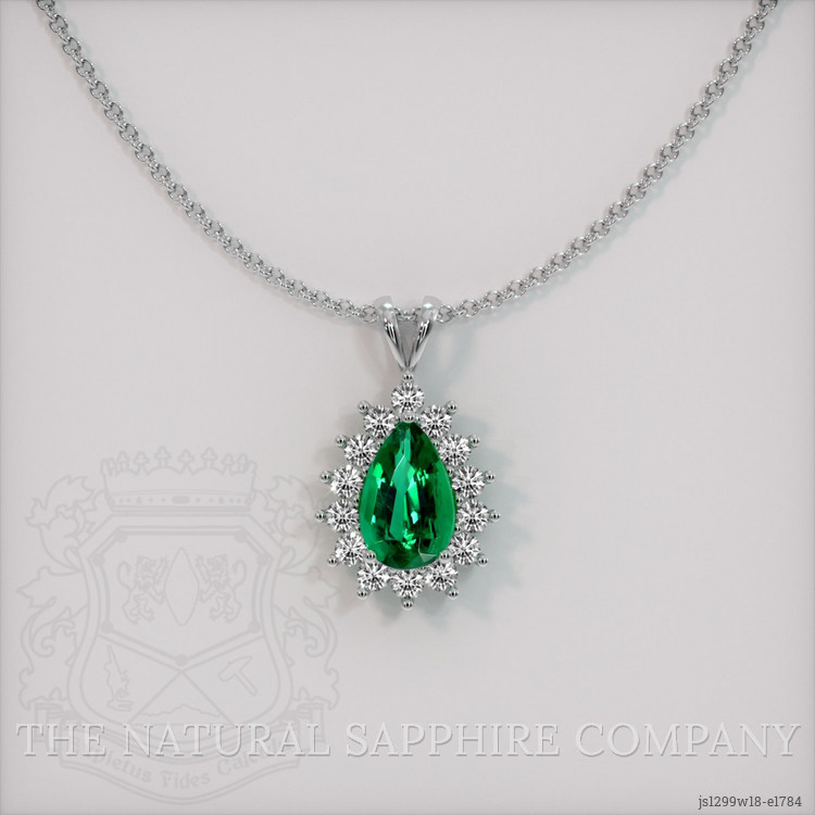 The pendant features a beautiful, transparent 1.12 carat pear shape green emerald with the dimensions of 9.24 x 5.97 x 3.92 mm and a mixed brilliant cut. It has a clarity grade of very slightly included (evaluated at eye level), vivid color saturation, and an excellent polish. The origin of this emerald is Zambia.