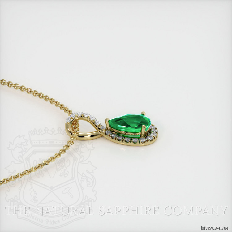 The pendant features a beautiful, transparent 1.12 carat pear shape green emerald with the dimensions of 9.24 x 5.97 x 3.92 mm and a mixed brilliant cut. It has a clarity grade of very slightly included (evaluated at eye level), vivid color saturation, and an excellent polish. The origin of this emerald is Zambia.