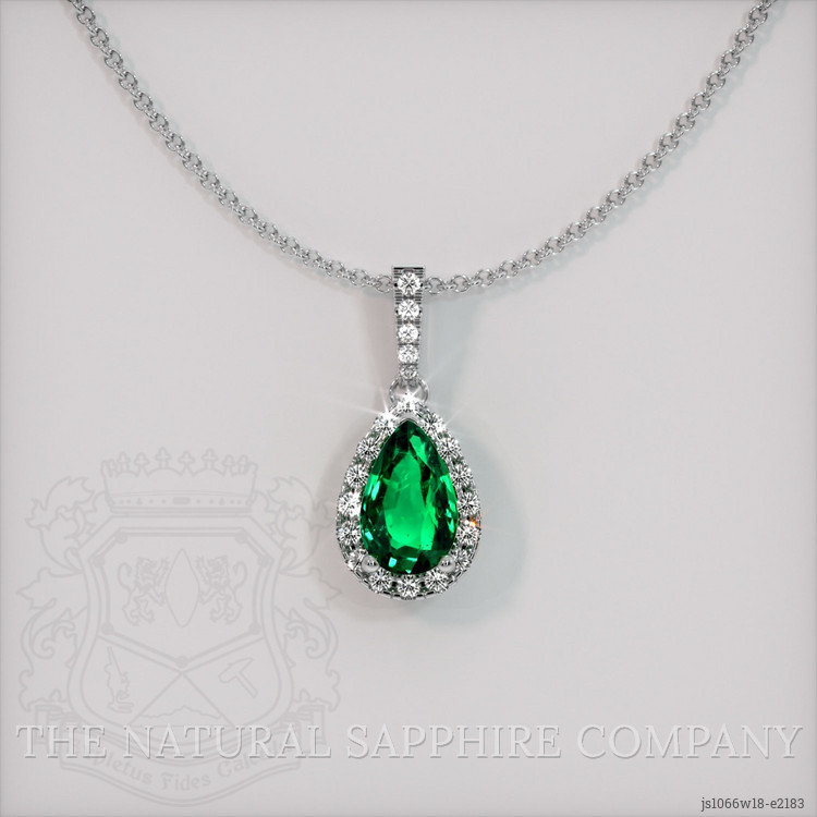 The pendant features a beautiful, transparent 1.36 carat pear shape green emerald with the dimensions of 9.26 x 5.73 x 4.45 mm and a mixed brilliant cut. It has a clarity grade of very slightly included (evaluated at eye level), vivid color saturation, and an excellent polish. The origin of this emerald is Zambia.