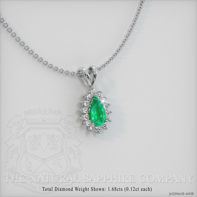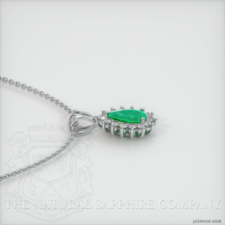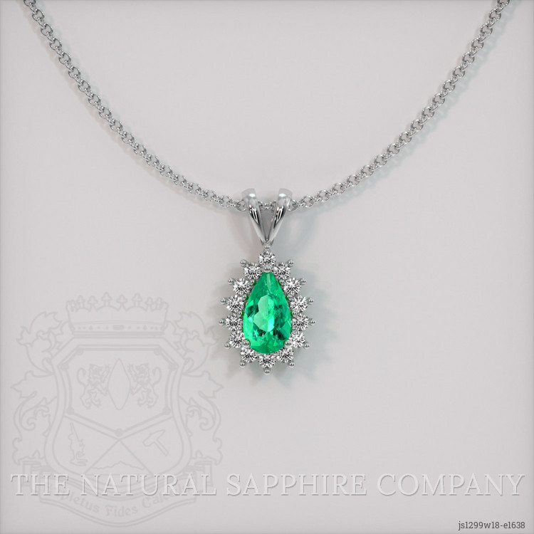 The pendant features a beautiful, transparent 2.04 carat pear shape green emerald with the dimensions of 12.75 x 7.15 x 4.70 mm and a mixed brilliant cut. It has a clarity grade of slightly included (evaluated at eye level), medium color saturation, and an excellent polish. The origin of this emerald is Colombia.