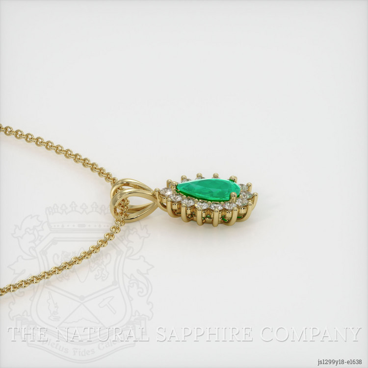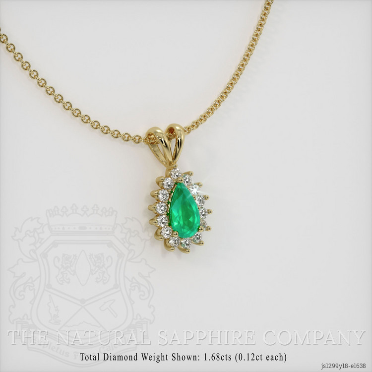The pendant features a beautiful, transparent 2.04 carat pear shape green emerald with the dimensions of 12.75 x 7.15 x 4.70 mm and a mixed brilliant cut. It has a clarity grade of slightly included (evaluated at eye level), medium color saturation, and an excellent polish. The origin of this emerald is Colombia.