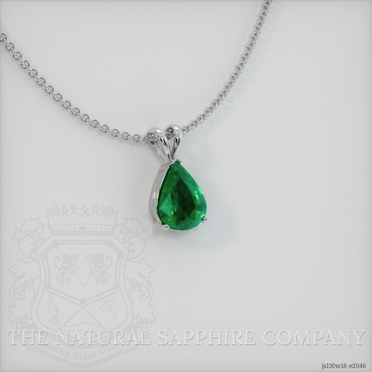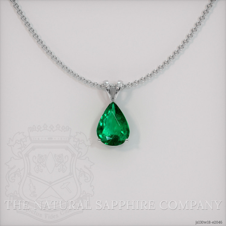 The pendant features a beautiful, transparent 2.42 carat pear shape green emerald with the dimensions of 11.49 x 8.97 x 4.93 mm and a mixed brilliant cut. It has a clarity grade of slightly included (evaluated at eye level), intense color saturation, and an excellent polish. The origin of this emerald is Zambia.
