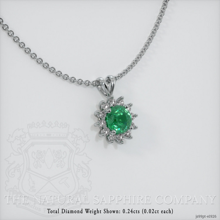 The pendant features a beautiful, transparent 0.80 carat round shape green emerald with the dimensions of 6.23 x 6.05 x 3.70 mm and a mixed brilliant cut. It has a clarity grade of very slightly included (evaluated at eye level), medium color saturation, and an excellent polish. The origin of this emerald is Zambia.