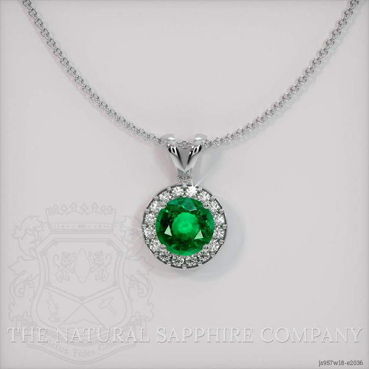 The pendant features a beautiful, transparent 0.85 carat round shape green emerald with the dimensions of 6.37 x 6.37 x 3.88 mm and a mixed brilliant cut. It has a clarity grade of very slightly included (evaluated at eye level), vivid color saturation, and an excellent polish. The origin of this emerald is Zambia.