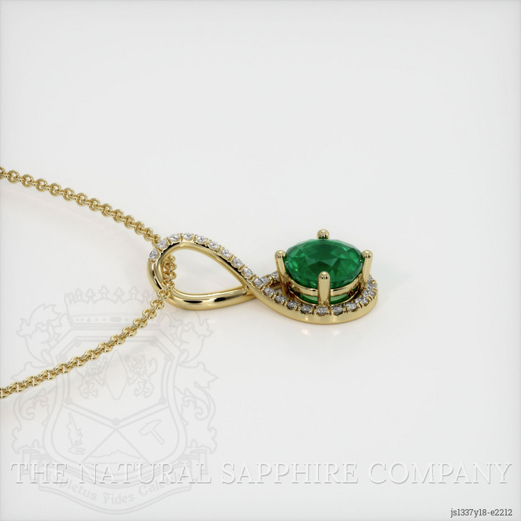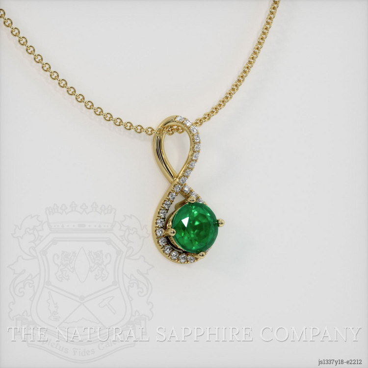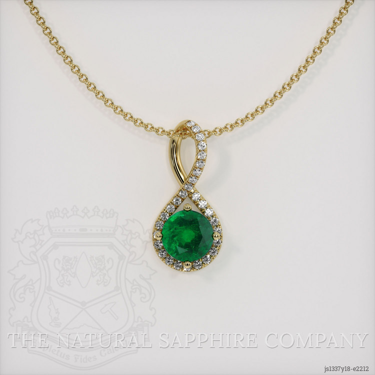The pendant features a beautiful, transparent 1.06 carat round shape green emerald with the dimensions of 6.52 x 6.45 x 4.58 mm and a mixed brilliant cut. It has a clarity grade of slightly included (evaluated at eye level), vivid color saturation, and an excellent polish. The origin of this emerald is Zambia.