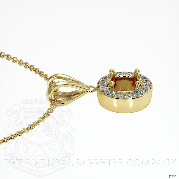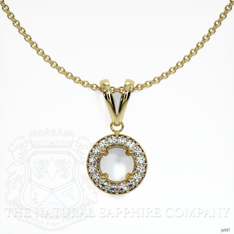 The pendant features a beautiful, transparent 1.20 carat round shape green emerald with the dimensions of 6.94 x 6.79 x 4.79 mm and a mixed brilliant cut. It has a clarity grade of slightly included (evaluated at eye level), medium color saturation, and an excellent polish. The origin of this emerald is Zambia.