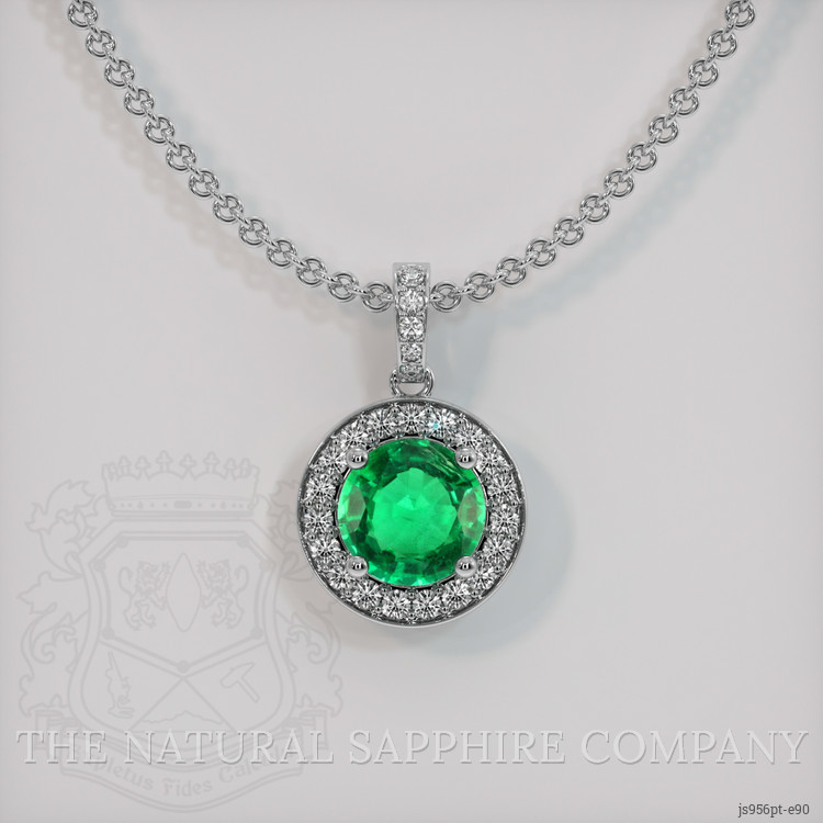 The pendant, set entirely in platinum 950, features a captivating 1.25 carat round shape green emerald, providing both elegance and durability. With dimensions of 7.31 x 7.23 x 4.01 mm, this emerald possesses a mixed brilliant cut, maximizing its natural luminescence while maintaining a classic aesthetic. The emerald boasts a clarity grade of very slightly included, evaluated at eye level, highlighting its exceptional quality. It also exhibits vivid color saturation with an excellent polish, revealing its vibrant hue and refined finish. The emerald originates from Zambia, known for producing emeralds with such distinguished properties.