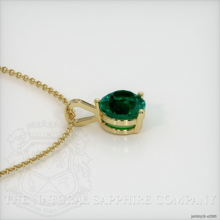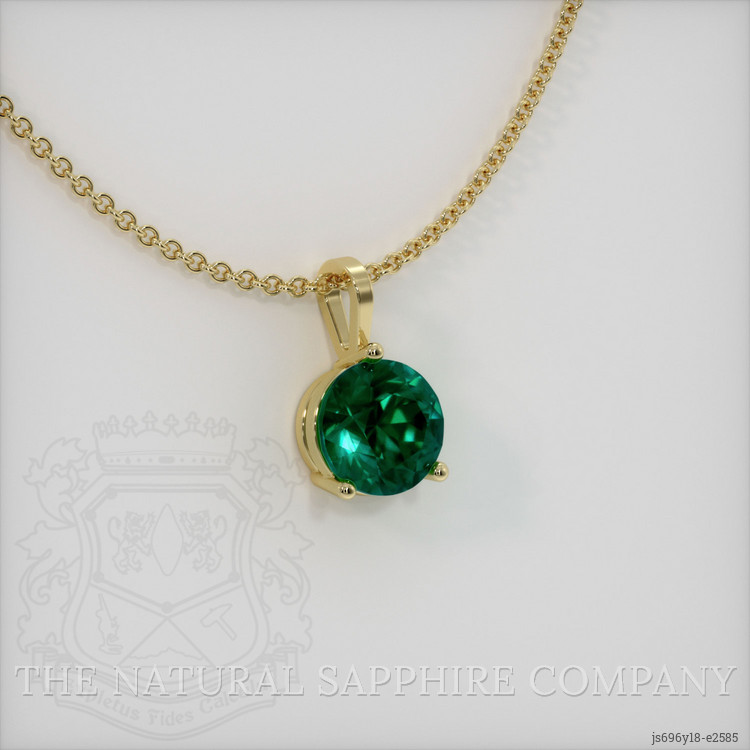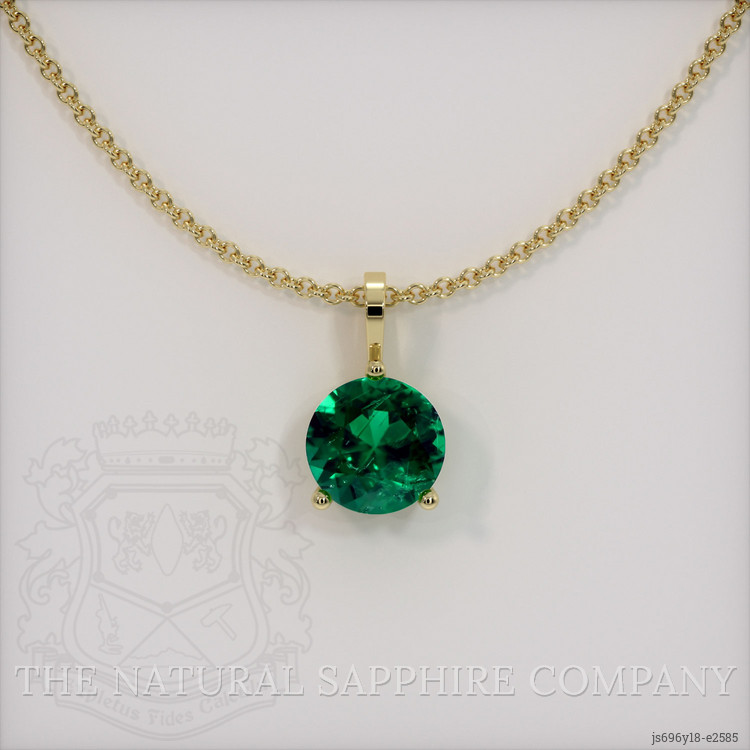 The pendant features a beautiful, transparent 1.45 carat round shape green emerald with the dimensions of 7.33 x 7.29 x 5.14 mm and a mixed brilliant cut. It has a clarity grade of very slightly included (evaluated at eye level), vivid color saturation, and an excellent polish. The origin of this emerald is Zambia.