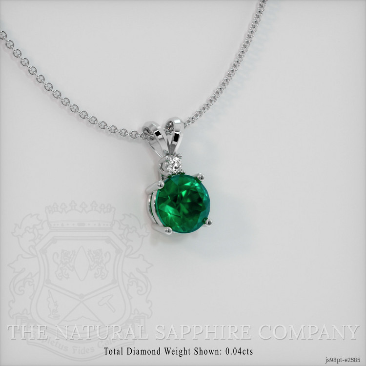 The pendant features a beautiful, transparent 1.45 carat round shape green emerald with the dimensions of 7.33 x 7.29 x 5.14 mm and a mixed brilliant cut. It has a clarity grade of very slightly included (evaluated at eye level), vivid color saturation, and an excellent polish. The origin of this emerald is Zambia.