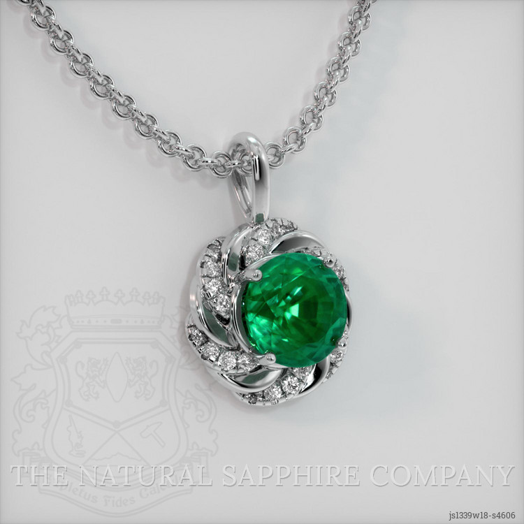 The pendant features a beautiful, transparent 4.36 carat round shape green emerald with the dimensions of 10.06 x 9.89 x 8.22 mm and a mixed brilliant cut. It has a clarity grade of slightly included (evaluated at eye level), intense color saturation, and an excellent polish. The origin of this emerald is Zambia.