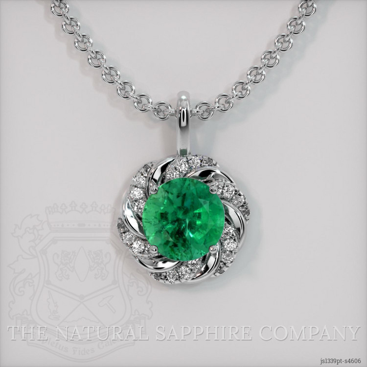 The pendant features a beautiful, transparent 4.36 carat round shape green emerald with the dimensions of 10.06 x 9.89 x 8.22 mm and a mixed brilliant cut. It has a clarity grade of slightly included (evaluated at eye level), intense color saturation, and an excellent polish. The origin of this emerald is Zambia.
