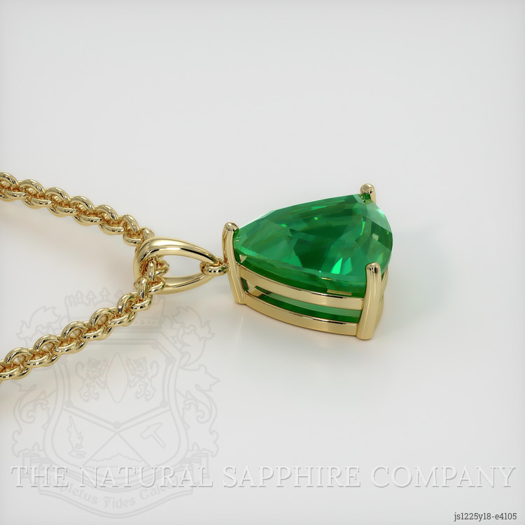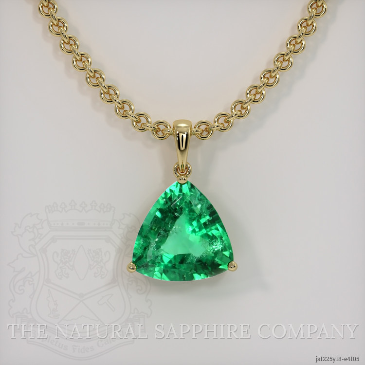 This pendant is meticulously crafted in 18K yellow gold. It prominently features a striking, transparent green emerald in a trillion shape. The gem, boasting a substantial weight of 5.66 carats, measures 12.26 x 12.98 x 7.24 mm and exhibits a trillion cut. Upon examination, the emerald reveals a clarity grade of slightly included when assessed at eye level, paired with an intense color saturation that greatly enhances its visual impact. The craftsmanship of the pendant is further highlighted by the excellent polish of the emerald, ensuring an impeccable finish. This captivating gemstone has its origins in Brazil, known for producing high-quality emeralds. The pendant is complemented by a finely crafted yellow gold chain, providing both durability and an attractive framing for the vibrant green gemstone. The combination of the yellow gold setting and the vivid green hue of the emerald creates a piece of jewelry that is both elegant and timeless.