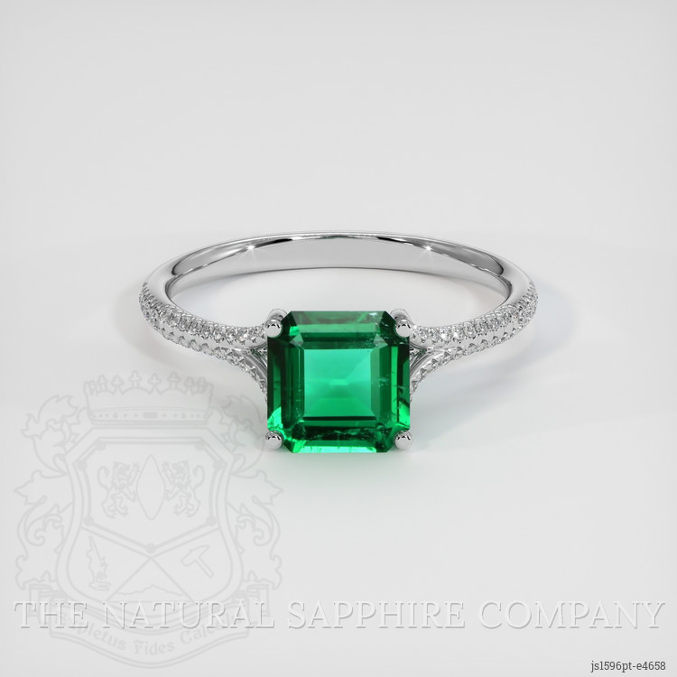 The ring features a beautiful, transparent 1.41 carat asscher - octagon shape green emerald with the dimensions of 7.23 x 7.16 x 3.68 mm and a asscher cut. It has a clarity grade of eye clean (evaluated at eye level), vivid color saturation, and an excellent polish. The origin of this emerald is Zambia.