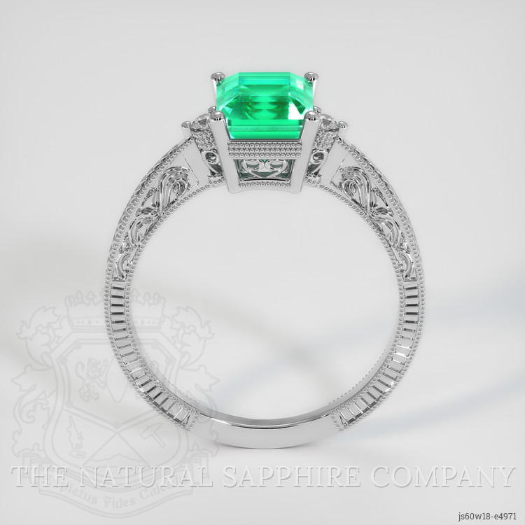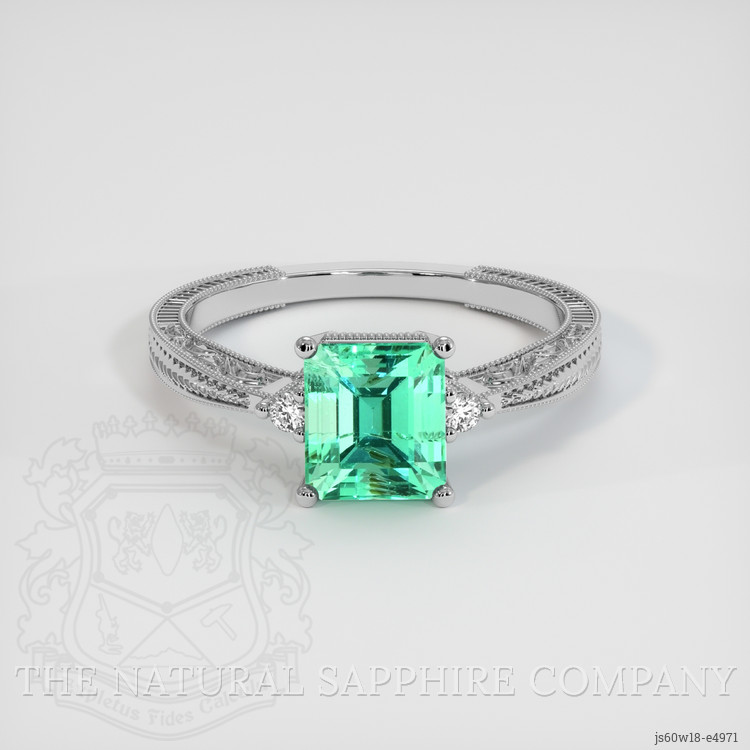 The Natural Emerald Company is proud to present a masterpiece of elegance and sophistication that speaks not only to the beauty of the extraordinary gemstones it incorporates but also to the symbolic depth instilled in its design. Featuring a stunning 1.46 carat asscher-cut green emerald, this ring is a statement piece that combines nature’s brilliance with superior craftsmanship. The emerald, with its octagonal allure, measures 6.77 x 6.06 x 5.30 mm and presents an arresting spectacle of sheer transparency and intense color saturation, which is vividly rare. Similar emeralds are often overshadowed by visible inclusions and moderate color intensity, making ours particularly unique with its very slightly included clarity and rich green hue.