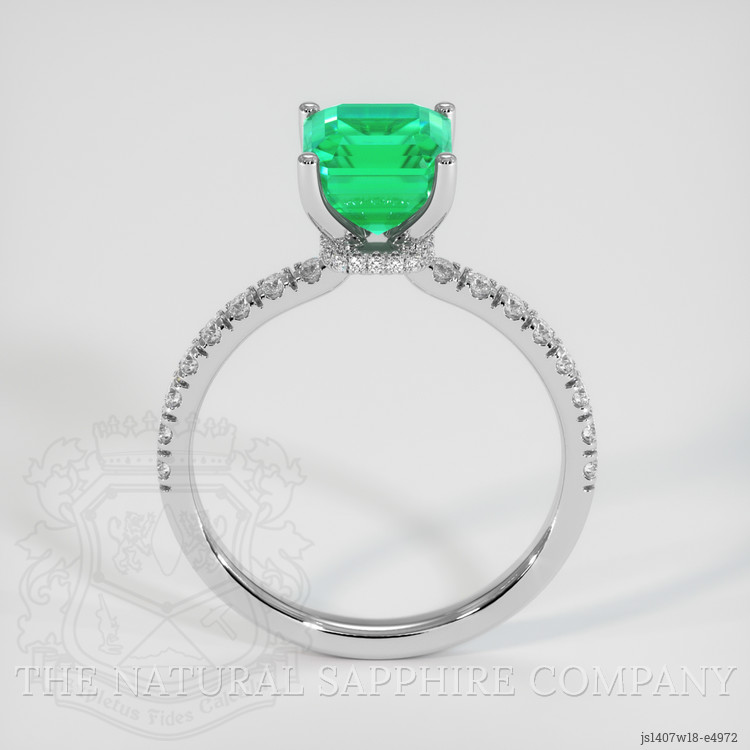 Set entirely in lustrous 18K white gold, the band of the ring exudes an aura of purity and timelessness. This meticulously handcrafted setting ensures both durability and grace, cradling the gemstones in a seamlessly elegant embrace. The natural sheen of the white gold serves as a flawless canvas that magnifies the brilliance of both emerald and diamonds, while the excellent polish ensures that each surface gleams with pristine regality.