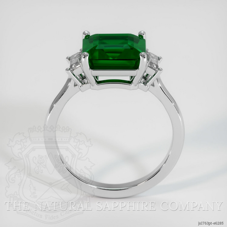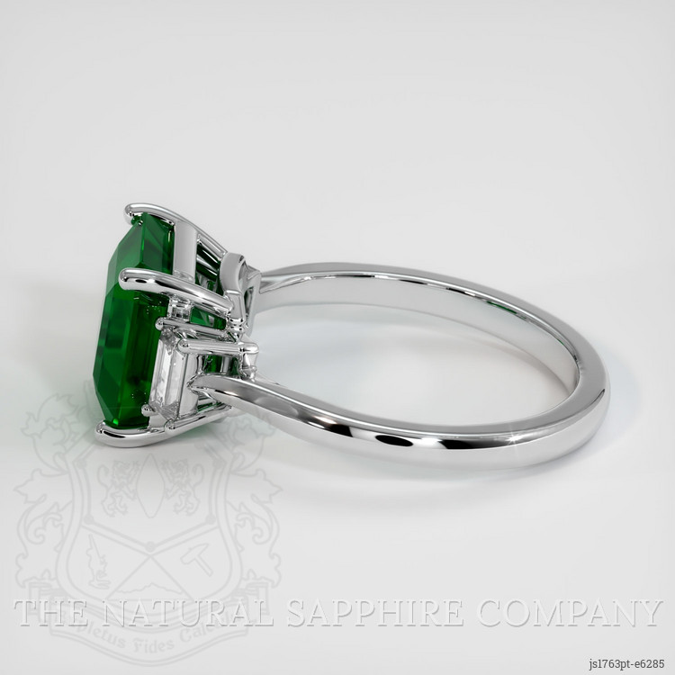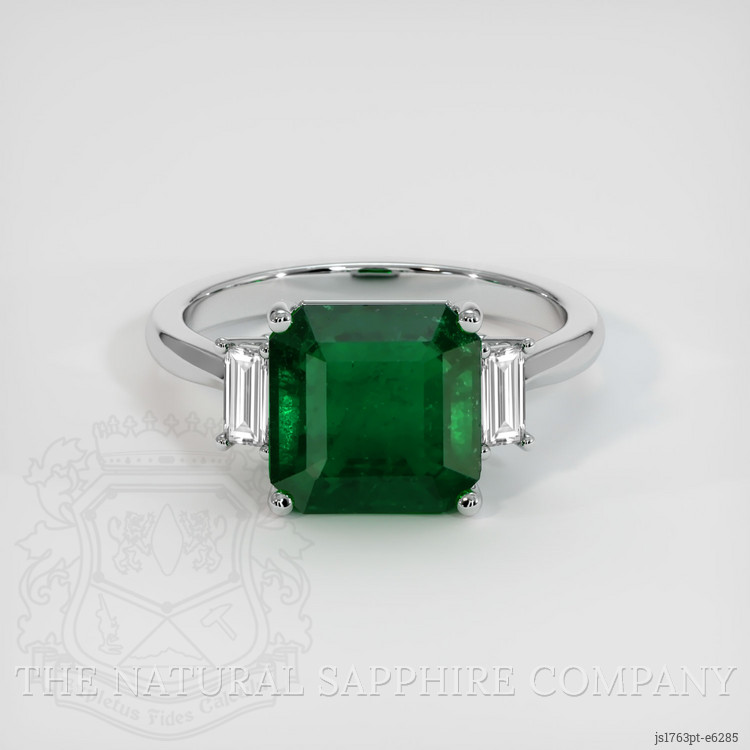 Set alongside this emerald are the elegant white baguette diamonds, each contributing approximately 0.28 carats. Their VS1 and VS2 clarity, coupled with a color grade of E, paint a picture of precision and sophistication. These diamonds create a stunning harmony with the centerpiece emerald, offering a tasteful blend of brilliance and elegance. Crafted entirely in platinum 950, the ring promises both durability and a timeless aesthetic. This exquisite combination exudes a regal essence, making it a fitting choice for those who appreciate the finer details.