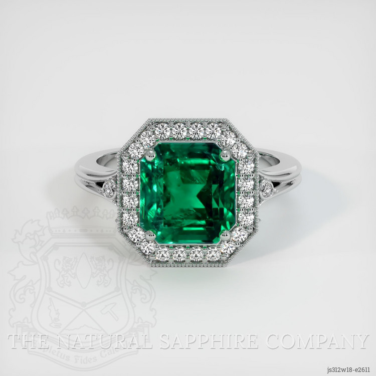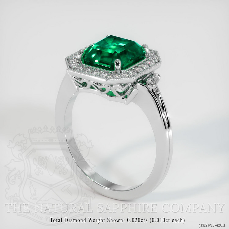 The ring features a beautiful, transparent 2.79 carat asscher - octagon shape green emerald with the dimensions of 8.39 x 7.67 x 6.19 mm and a asscher cut. It has a clarity grade of very slightly included (evaluated at eye level), vivid color saturation, and an excellent polish. The origin of this emerald is Zambia.