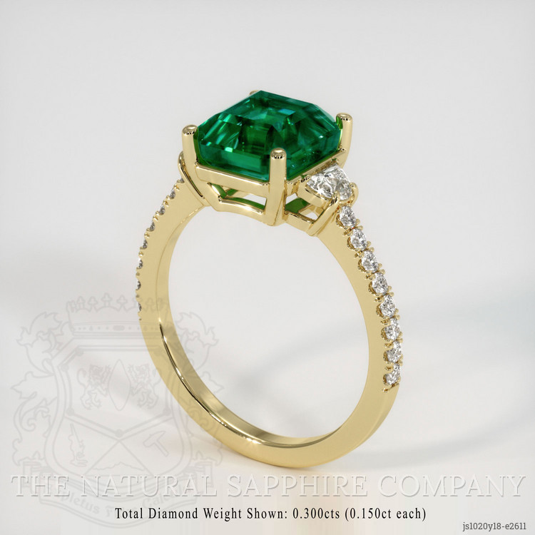 The ring features a beautiful, transparent 2.79 carat asscher - octagon shape green emerald with the dimensions of 8.39 x 7.67 x 6.19 mm and a asscher cut. It has a clarity grade of very slightly included (evaluated at eye level), vivid color saturation, and an excellent polish. The origin of this emerald is Zambia.