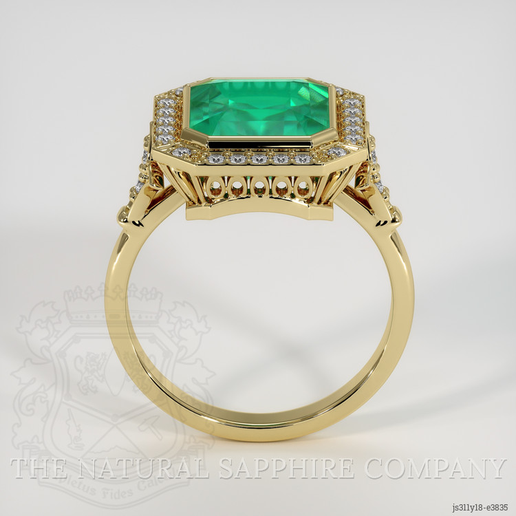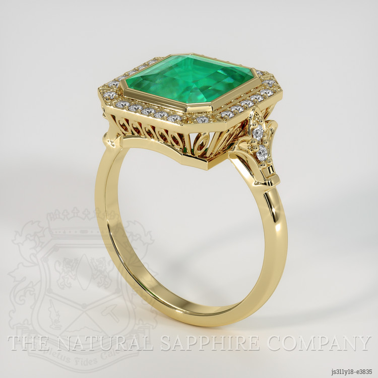 The ring features a beautiful, transparent 3.11 carat asscher - octagon shape green emerald with the dimensions of 9.75 x 9.04 x 5.16 mm and a step cut. It has a clarity grade of slightly included (evaluated at eye level), intense color saturation, and an excellent polish. The origin of this emerald is Brazil.