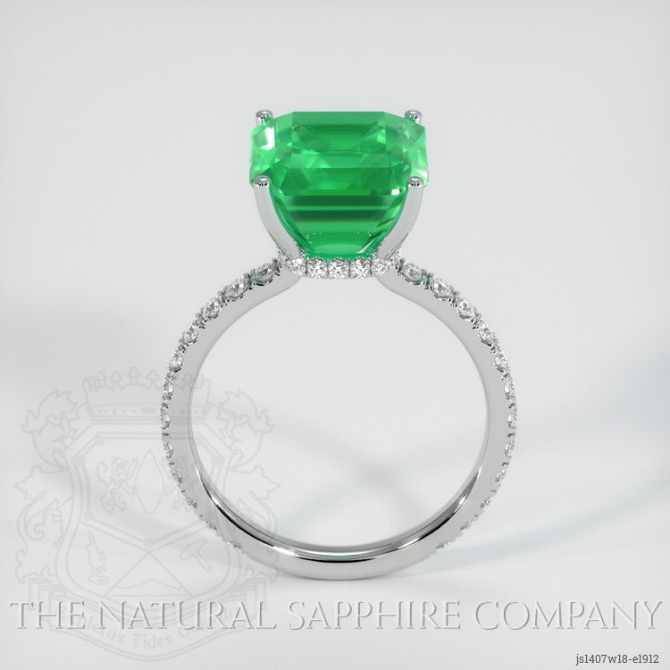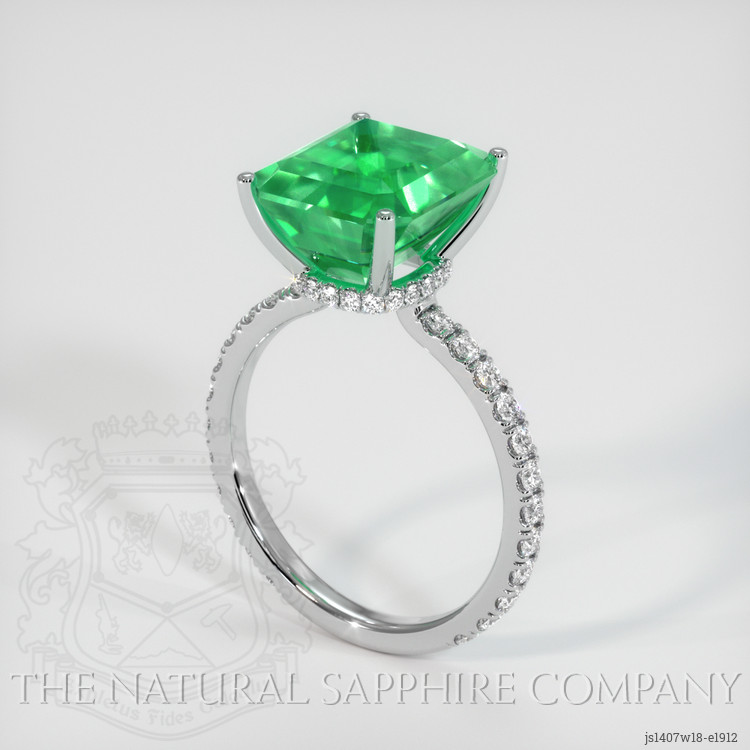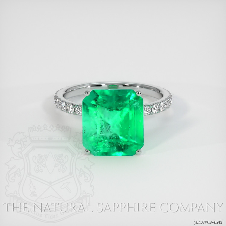 The ring features a beautiful, transparent 4.73 carat emerald cut shape green emerald with the dimensions of 10.76 x 9.81 x 7.20 mm and a emerald cut. It has a clarity grade of slightly included (evaluated at eye level), medium color saturation, and an excellent polish. The origin of this emerald is Colombia.