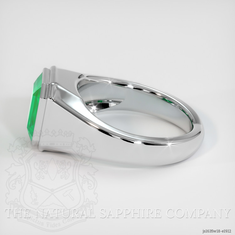 The men's ring features a beautiful, transparent 4.73 carat emerald cut shape green emerald with the dimensions of 10.76 x 9.81 x 7.20 mm and a emerald cut. It has a clarity grade of slightly included (evaluated at eye level), medium color saturation, and an excellent polish. The origin of this emerald is Colombia.