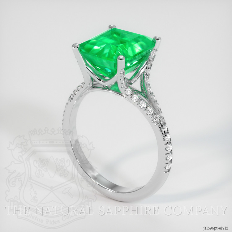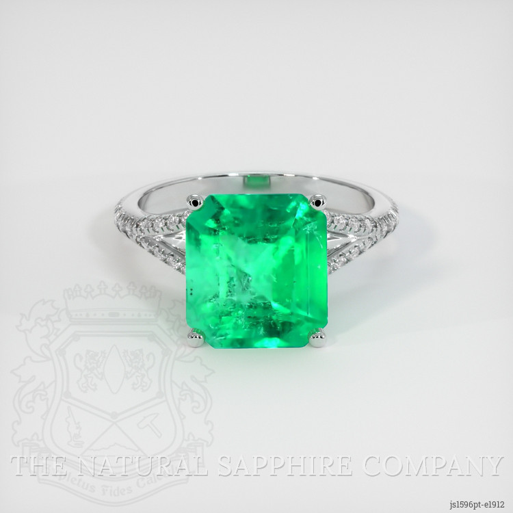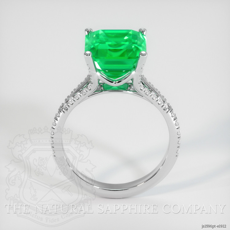 The ring features a beautiful, transparent 4.73 carat emerald cut shape green emerald with the dimensions of 10.76 x 9.81 x 7.20 mm and a emerald cut. It has a clarity grade of slightly included (evaluated at eye level), medium color saturation, and an excellent polish. The origin of this emerald is Colombia.