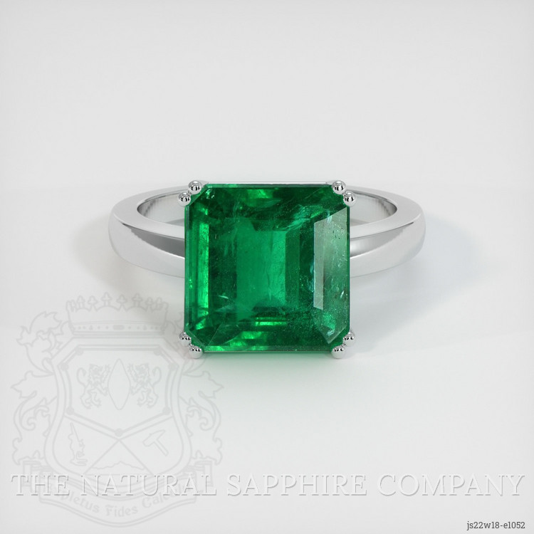 The ring features a beautiful, transparent 4.95 carat asscher - octagon shape green emerald with the dimensions of 10.29 x 10.12 x 6.43 mm and a asscher cut. It has a clarity grade of slightly included (evaluated at eye level), vivid color saturation, and an excellent polish. The origin of this emerald is Zambia.