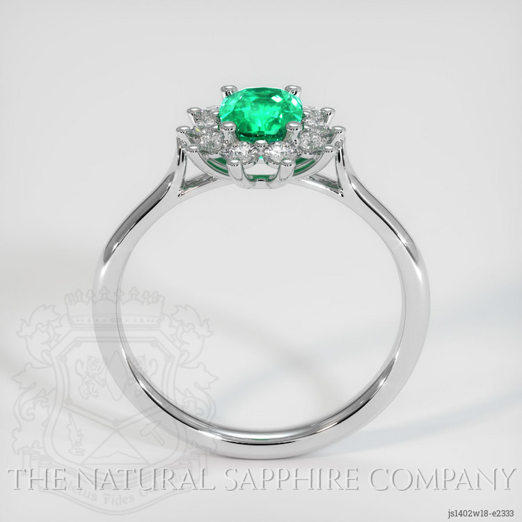 The ring features a beautiful, transparent 0.97 carat cushion shape green emerald with the dimensions of 6.98 x 5.45 x 3.90 mm and a mixed brilliant cut. It has a clarity grade of slightly included (evaluated at eye level), medium color saturation, and an excellent polish. The origin of this emerald is Zambia.