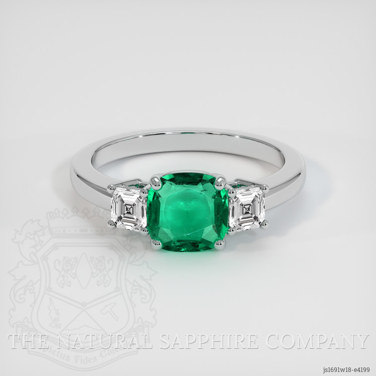 The ring features a beautiful transparent 1.09 carat cushion shape green emerald with dimensions of 6.99 x 6.83 x 3.19 mm and a mixed brilliant cut. It has a clarity grade of very slightly included evaluated at eye level intense color saturation and an excellent polish. The origin of this emerald is Zambia. Also featured in the ring are white Asscher octagon shaped diamonds weighing approximately 0.46 carats each with a clarity of Very Slightly Included VS1 VS2 and a color grade of E. The ring is entirely set in 18K white gold. This exquisite piece offers a harmonious balance of elegance and sophistication making it a versatile addition to any jewelry collection. Its vibrant green emerald complements other pieces such as diamond earrings and silver bracelets allowing for a seamless integration into existing ensembles. The white gold setting further enhances its ability to pair with various metals ensuring that the ring not only stands out as a statement piece but also blends gracefully within a wider collection. The precise craftsmanship and attention to detail reflected in its design supports its timeless appeal making it suitable for both everyday wear and special occasions. Furthermore the exceptional qualities of the emerald coupled with the refined brilliance of the diamonds result in a ring that personifies luxury and refinement. Whether worn alone or alongside other fine jewelry this ring exemplifies a classic yet contemporary aesthetic highlighting the beauty and individuality of its wearer.
