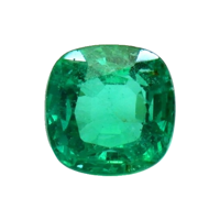 The ring features a beautiful, transparent 1.52 carat cushion shape green emerald with the dimensions of 6.87 x 6.86 x 4.79 mm and a mixed brilliant cut. It has a clarity grade of slightly included (evaluated at eye level), medium color saturation, and an excellent polish. The origin of this emerald is Zambia.