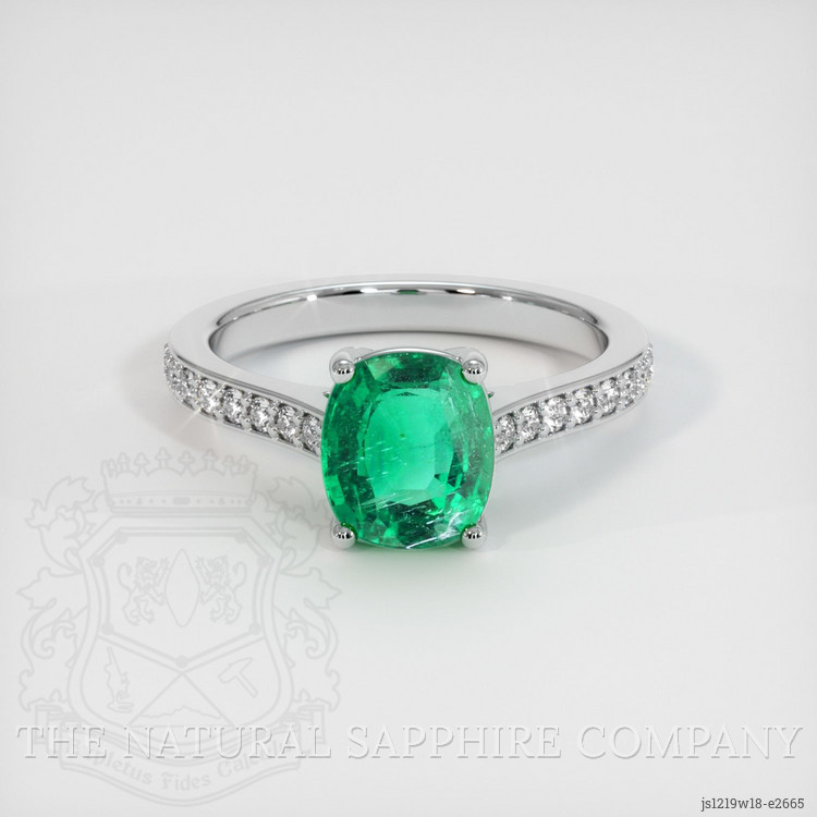 The ring features a beautiful, transparent 1.82 carat cushion shape green emerald with the dimensions of 7.87 x 6.88 x 4.80 mm and a mixed brilliant cut. It has a clarity grade of very slightly included (evaluated at eye level), intense color saturation, and an excellent polish. The origin of this emerald is Zambia.