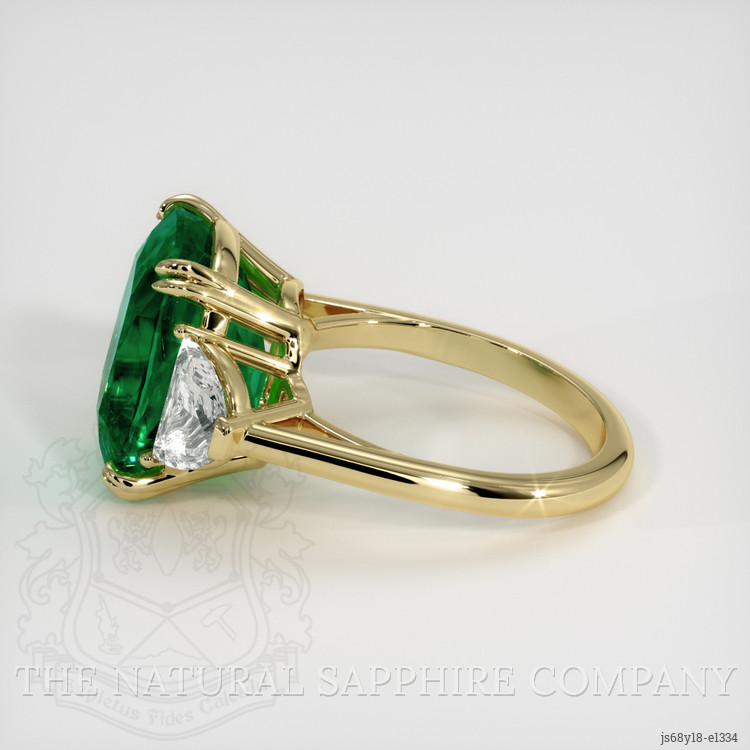 Graced with an 18K yellow gold setting, reference JS68, the ring is an exquisite marriage of classic elegance and modern craftsmanship. The emerald is flanked by two sidestones, diamonds of grade E, each weighing 0.7 carats, their brilliance accentuating the emerald's lush green tones.