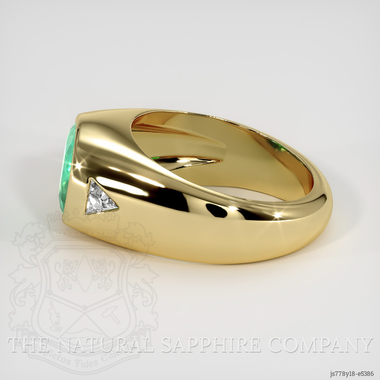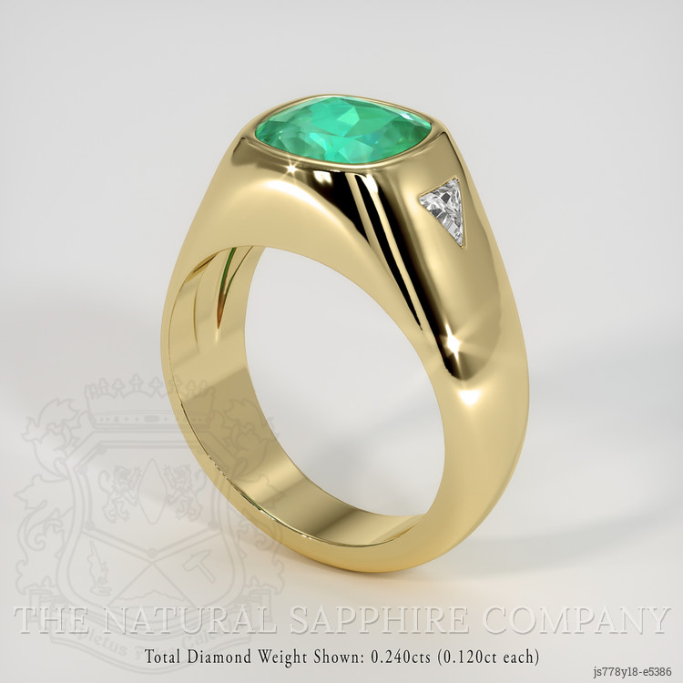 Paired with the emerald are white trillion-shaped natural diamonds, contributing approximately 0.24 carats to the overall grandeur of this masterpiece. These diamonds, with a clarity of Very Slightly Included (VS1, VS2), and an impressive color grade of E, bring out the best in the emerald while adding a touch of undeniable sophistication. Their unique shape harmonizes beautifully with the cushion-shaped emerald, showcasing the expert craftsmanship that The Natural Emerald Company is renowned for. Set entirely in 18K yellow gold, the ring's design highlights a timeless elegance that caters to those desiring a statement piece with a subtle yet definite presence.