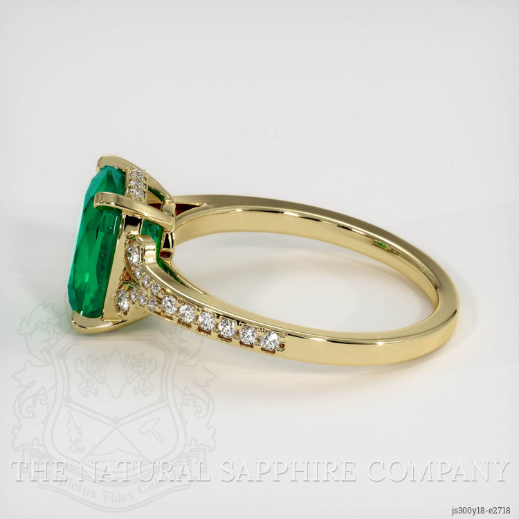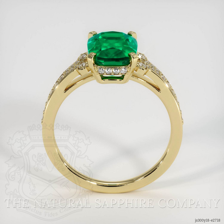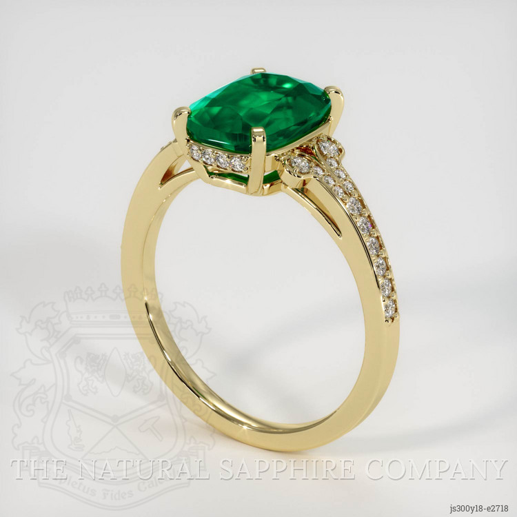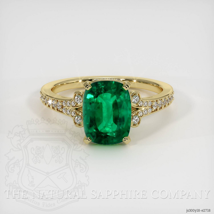 The ring features a beautiful, transparent 2.28 carat cushion shape green emerald with the dimensions of 9.22 x 7.02 x 5.19 mm and a mixed brilliant cut. It has a clarity grade of slightly included (evaluated at eye level), vivid color saturation, and an excellent polish. The origin of this emerald is Zambia.
