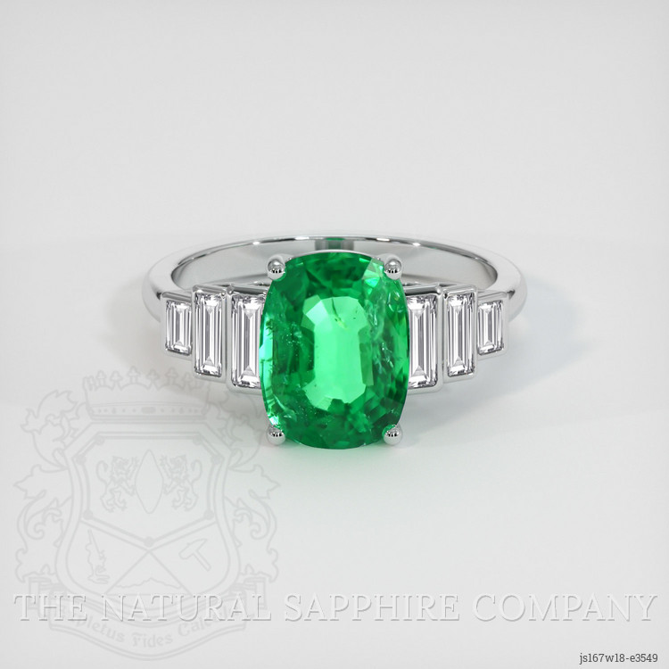 Accompanying the emerald in this ring are baguette-shaped diamonds, each selected for their superior quality and brilliance. The ring includes white baguette diamonds weighing approximately 0.38 carats with a clarity grade of very slightly included (VS1, VS2) and a color grade of E, ensuring they are virtually free of inclusions and possess exceptional whiteness. Additionally, the ring features other white baguette diamonds, weighing approximately 0.16 carats and 0.10 carats respectively, also with clarity grades of VS1 and VS2, and color grades of E, ensuring visual harmony and elegant cohesion in the piece.