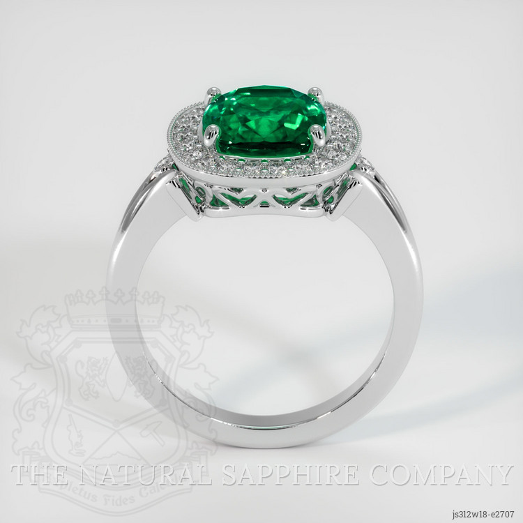 The ring features a beautiful, transparent 2.44 carat cushion shape green emerald with the dimensions of 8.73 x 7.85 x 5.51 mm and a mixed brilliant cut. It has a clarity grade of very slightly included (evaluated at eye level), vivid color saturation, and an excellent polish. The origin of this emerald is Zambia.