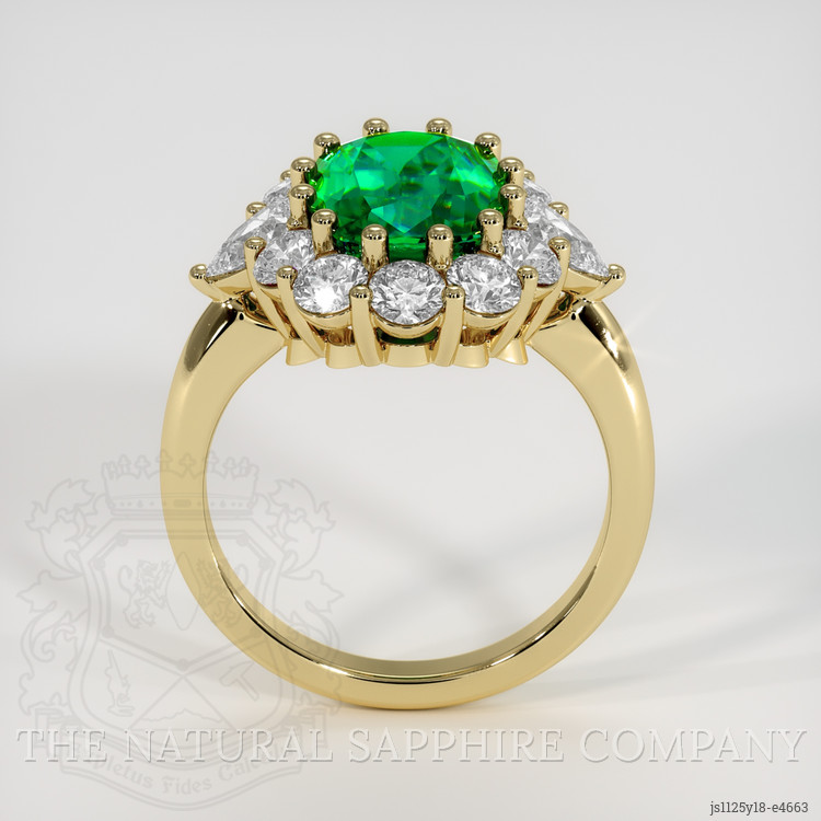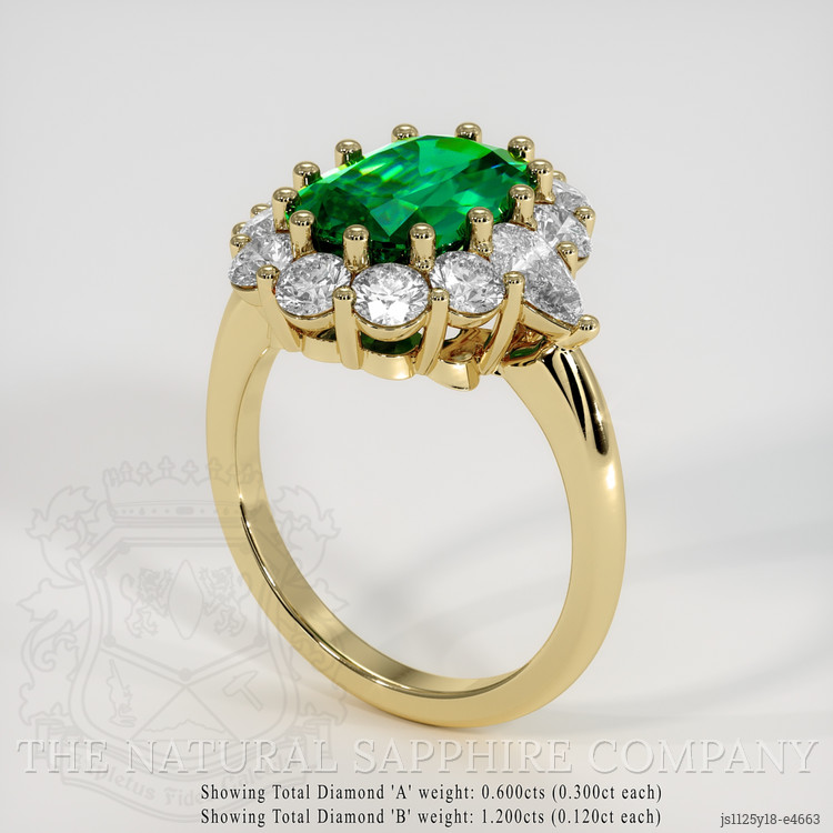 Encircling this magnificent emerald, white pear-shaped diamonds totaling 0.60 carats nestle with grace. Each diamond, with a clarity grade of VS1 to VS2 and a captivating G color grade, magnifies the emerald’s vivacious glow. Further enhancing this incredible ring are sparkling white round diamonds weighing a total of 1.20 carats. These diamonds, bearers of a crystallized history, boast a color grade of E and mirror the transparency akin to the world’s purest aesthetic traditions. Their brilliant dance of light and reflection against the emerald's green depths adds an unparalleled essence of splendor, embellishing every gesture with their radiant beauty.