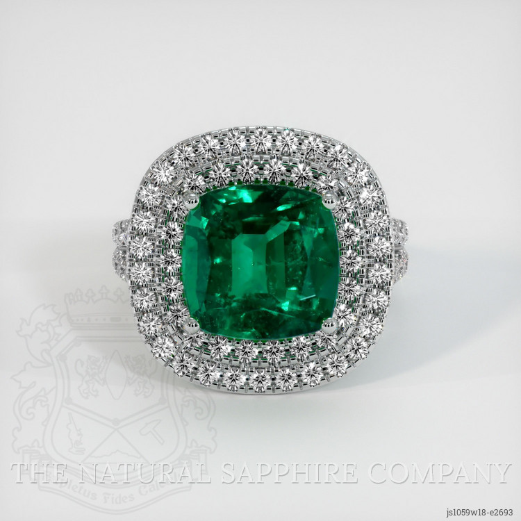 The ring features a beautiful, transparent C.Dunaigre certified 4.39 carat cushion shape green emerald with the dimensions of 9.93 x 9.81 x 6.74 mm and a mixed brilliant cut. It has a clarity grade of very slightly included (evaluated at eye level), vivid color saturation, and an excellent polish. The origin of this emerald is Zambia.