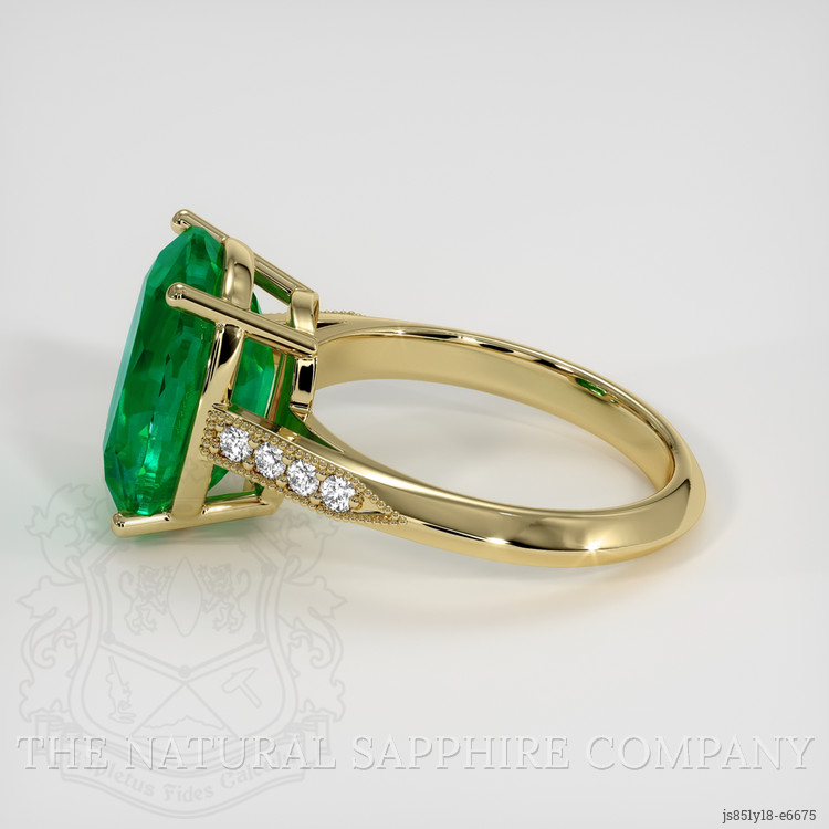 The ring is crafted entirely in 18K yellow gold, a choice that not only complements the vivid green of the emerald but also epitomizes luxury and timeless elegance. Yellow gold provides a classic warmth and richness, making it the perfect setting for such a precious gemstone. The design of the ring is thoughtfully crafted to ensure the utmost comfort and wearability while maintaining a striking visual impact. The setting is sturdy yet graceful, showcasing both the emerald and the diamonds in a manner that allows each stone to shine distinctly while contributing to the overall cohesive design.