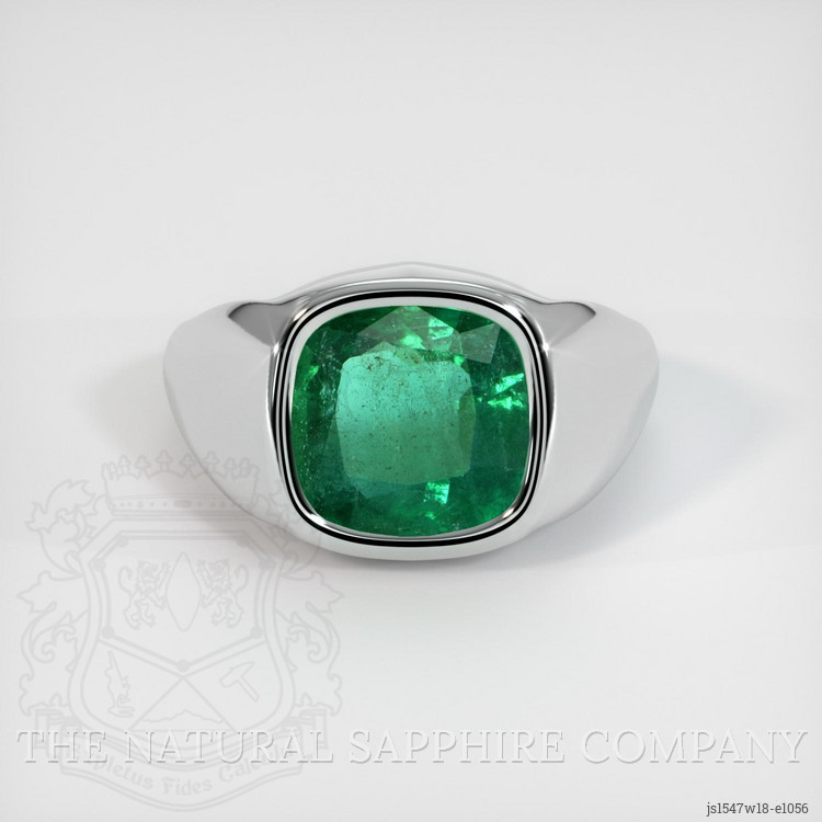 The men's ring features a beautiful, transparent 7.62 carat cushion shape green emerald with the dimensions of 12.71 x 12.33 x 7.35 mm and a mixed brilliant cut. It has a clarity grade of slightly included (evaluated at eye level), intense color saturation, and an excellent polish. The origin of this emerald is Zambia.
