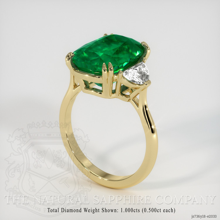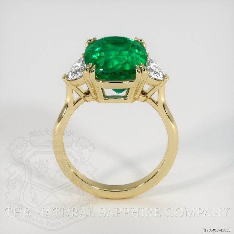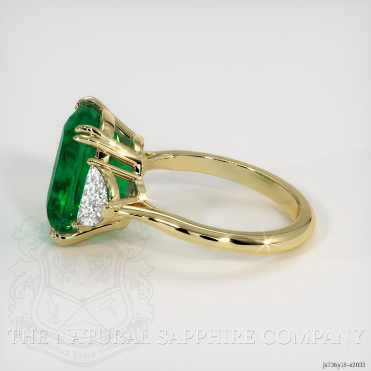 This emerald is nestled within an elegant 18K yellow gold setting, reference JS736, that has been meticulously designed to enhance the emeraldstone's natural beauty without overshadowing it. It is flanked by two diamonds, each weighing 0.5 carats, with an E color grade that complements the central stone's vibrant green with their clear, radiant sparkle.