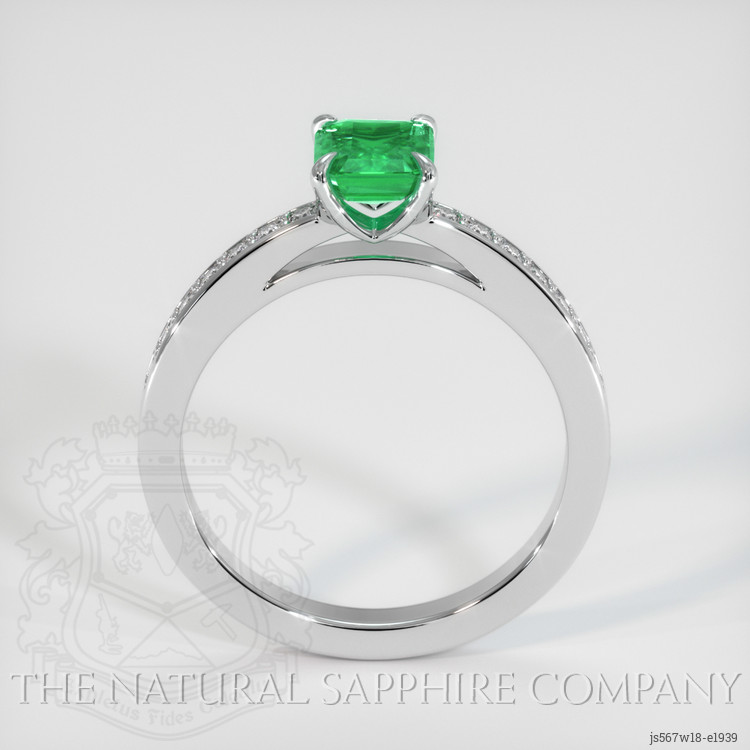 The ring features a beautiful, transparent 0.68 carat emerald cut shape green emerald with the dimensions of 6.33 x 5.24 x 2.95 mm and a emerald cut. It has a clarity grade of very slightly included (evaluated at eye level), medium color saturation, and an excellent polish. The origin of this emerald is Zambia.