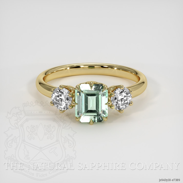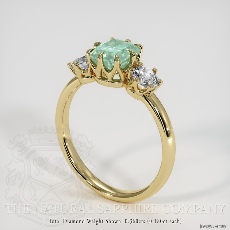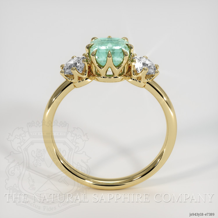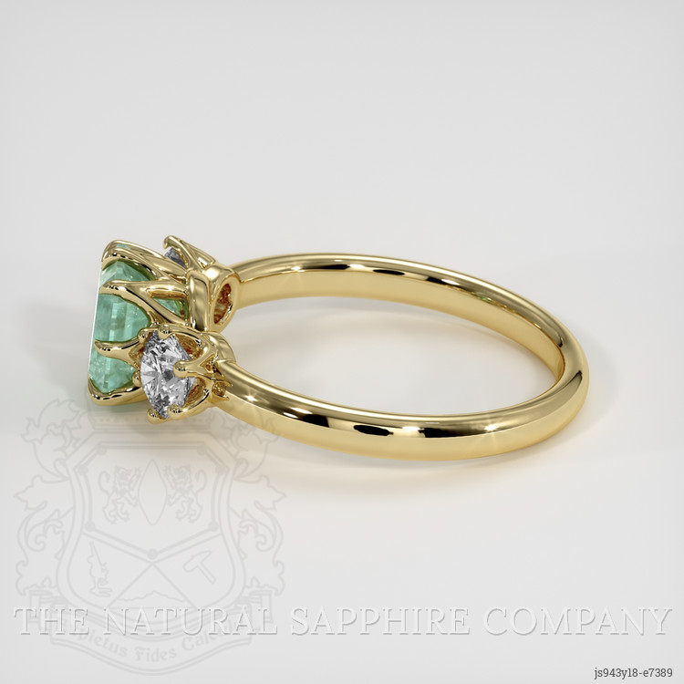 Flanking the emerald are white round shaped lab grown diamonds with a combined approximate weight of 0.36 carats, clarity grading Very Slightly Included with grades of VS1 and VS2, and a color grade of E, and these side stones contribute a crisp white contrast that visually enhances the green center. The round cut diamonds are engineered for maximum brilliance and fire, and in this setting they reflect high quality white light into the emerald facets so that the contrast between white sparkle and green flashes is optimized. The ring is crafted entirely in 18K yellow gold which complements the green tone through warm contrast, and the color of the gold also supports perceived depth of the emerald without overpowering its subtle saturation. For the educated buyer this ring represents a thoughtful combination of provenance, proportion and finishing. The Russian origin, the very very slightly included clarity evaluated at eye level, the excellent polish, and the intentional choice of an emerald cut to present the stone in its most favorable optical state are all factors that confer both aesthetic and trade value, and The Natural Emerald Company stands behind the selection and setting as an expression of responsible sourcing and skilled lapidary work.